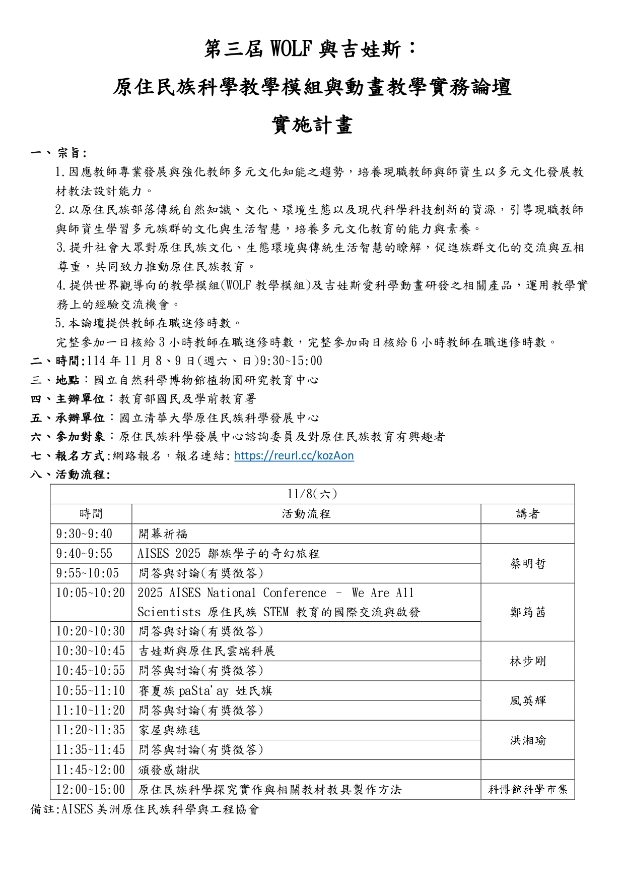 第三屆 WOLF 與吉娃斯原住民族科學教學模組與動畫教學實務論壇實施計畫PDF.