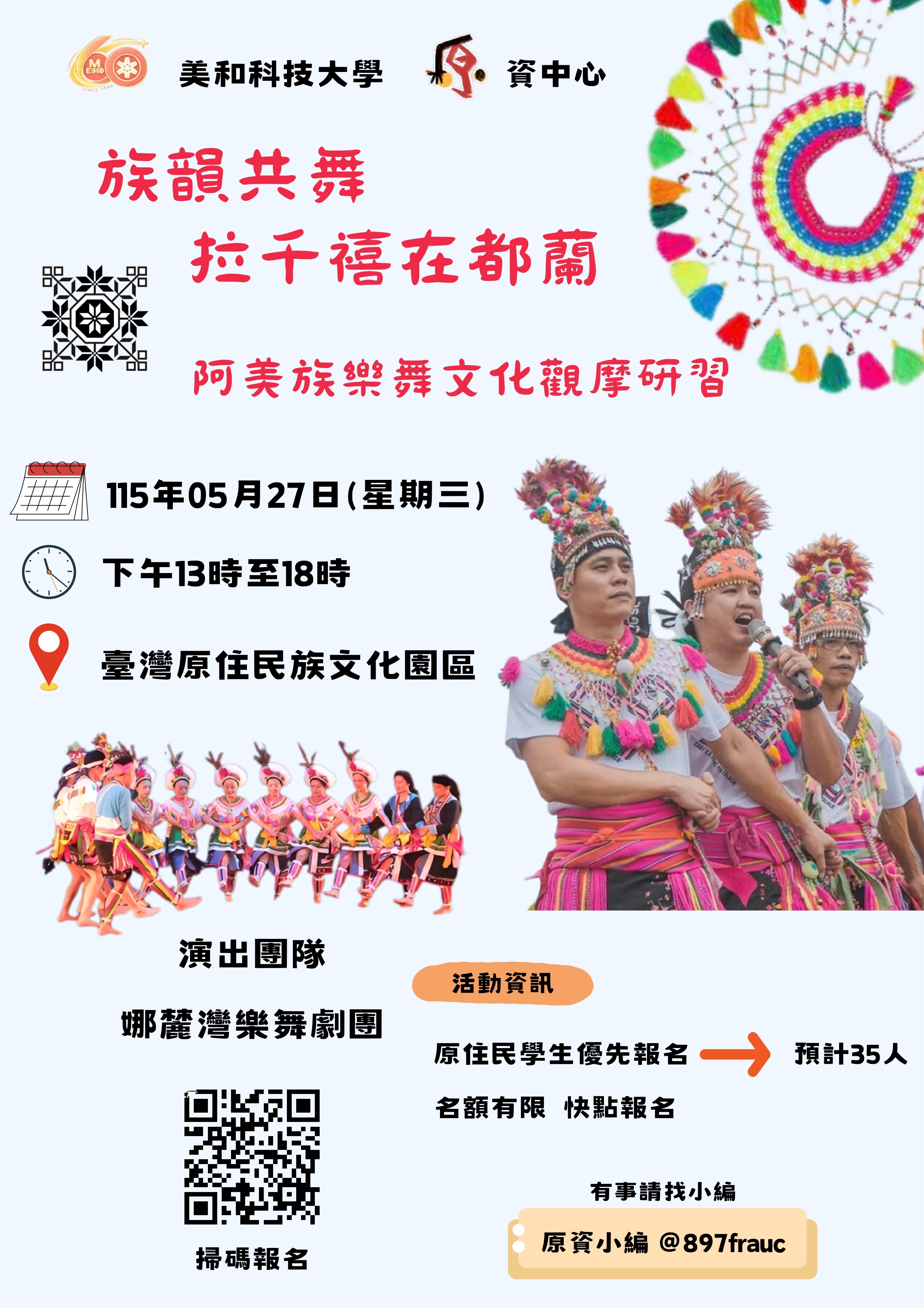 為深化本校原住民族學生對臺灣原住民族文化的理解,並強化文化認同與多元文化素養,本中心規劃帶領學生參與原住民族委員會原住民族文化發展中心辦理之「115年度本土教育人才培育計畫-生活本土」研習課程第二梯次《族韻共舞》展演活動。